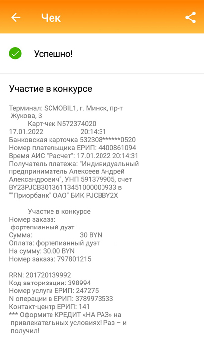 Примеры образцов документов, подтверждающих оплату организационного взноса в Республике Беларусь. Вид документов может быть разным. Это зависит от выбора банка, страны, платёжного терминала и т. п. При оплате на сайте конкурса на указанный Вами адрес электронной почты приходит чек WEBPAY.