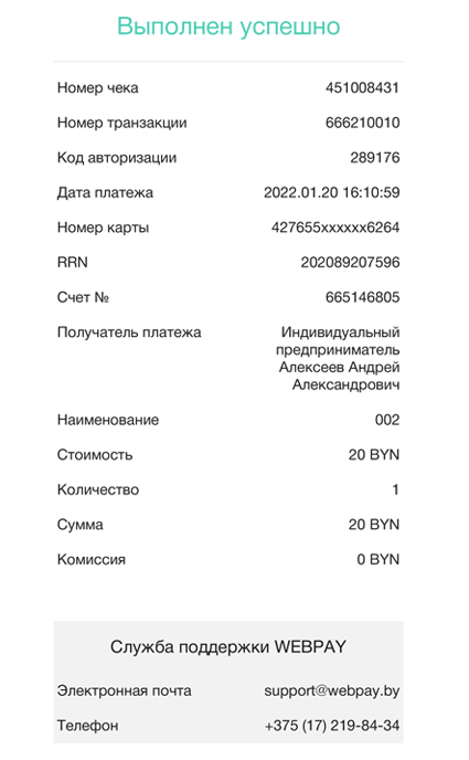 Образец платёжного документа, подтверждающего оплату на сайте конкурса с помощью системы WEBPAY. |