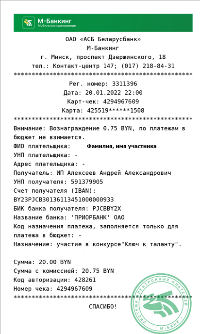 Примеры образцов документов, подтверждающих оплату организационного взноса в Республике Беларусь. Вид документов может быть разным. Это зависит от выбора банка, страны, платёжного терминала и т. п. При оплате на сайте конкурса на указанный Вами адрес электронной почты приходит чек WEBPAY.